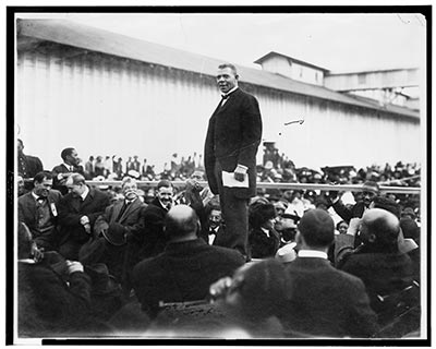 Pictured: Black and white photograph of Booker T. Washington addressing a crowd at Mound Bayou. Washington is standing on a platform, holding a white sheet of paper, and is wearing a black suit. The crowd makes a full circle below him, most dressed in black suits and dresses. In the background is a white building, likely used for Mound Bayou’s agricultural production.